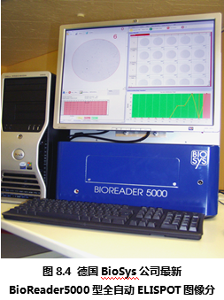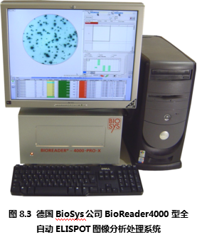 德國Bio-Sys公司從上世紀80年代開始就致力于生物圖像識別領域,在進入ELISPOT圖像分析儀市場后一直以其先進的ELISPOT斑點識別技術聞名。德國Bio-Sys公司首先解決了顯微攝像系統難以定位96孔板上的每一個孔的問題。其解決方法基于圖像識別技術,利用板孔邊壁和真正的孔底的細微差別,在機械定位的基礎上,通過軟件識別來進一步提高每孔的定位精度。是目前市場上所有ELISPOT圖像分析儀中唯一能夠完整識別整個孔底ELISPOT斑點圖像的設備。在對真假斑點的分辨中,德國Bio-Sys公司除了具備完善的物理學多參數識別技術,還特別針對ELISPOT斑點形成的生物學過程,通過細胞因子顯色后的“光密度”峰值積分分析方法,精確分辨真假斑點、融合斑點等復雜情況。Bioreader系列ELISPOT圖像分析儀國外大多數較有經驗的ELISPOT實驗室推崇的特點為:專業性和參數全開放性。因為ELISPOT實驗的復雜性,ELISPOT斑點形成在不同的實驗條件下有非常大的差異。這就對ELISPOT圖像分析儀提出了較高的要求:既要能夠保證斑點計數的真實性和一致性,又要能夠根據不同情況,通過實驗者的判斷來校正儀器對ELISPOT斑點識別的標準。要同時實現以上兩個要求,唯一的辦法是將儀器的所有判斷標準向ELISPOT實驗者開放,實現實驗者和儀器的互動。在這一方面,德國Bio-Sys公司始終走在ELISPOT斑點識別領域的前列,新的Bioreader-4000型(圖8.3)和Bioreader -5000(圖8.4) 型在專業性和適用性方面都領先于其他廠家的設備。
