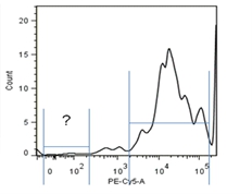 補(bǔ)償調(diào)節(jié)抗體的正確選擇對(duì)于熒光通道之間的補(bǔ)償調(diào)節(jié)是非常重要的。要求選擇的抗體所結(jié)合的抗原分子在樣本細(xì)胞中有明確表達(dá),占樣品細(xì)胞的10%以上,50%以下。如果陽(yáng)性細(xì)胞比例太低,在陽(yáng)性細(xì)胞區(qū)域無(wú)法形成明顯的細(xì)胞團(tuán),無(wú)法判斷調(diào)節(jié)是否合適。如陽(yáng)性細(xì)胞比例過(guò)高,則不表達(dá)該抗原的陰性細(xì)胞無(wú)法形成明顯的細(xì)胞團(tuán),如圖1-4直方圖所示。