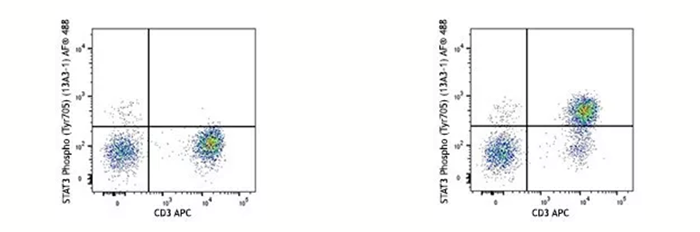 在蛋白翻譯后修飾(磷酸化、乙酰化、甲基化等)的研究過程中,固定劑不僅可以有效的“固定”住翻譯后修飾的位點(diǎn)(絲氨酸、蘇氨酸、酪氨酸等),也可以防止目標(biāo)位點(diǎn)在活細(xì)胞中很快降解(比如磷酸酶會(huì)去除磷酸化修飾、去甲基化酶會(huì)移除甲基化修飾等)。下面的例子是用IL-6的重組蛋白刺激人外周血15分鐘后看STAT3第705位酪氨酸的磷酸化水平,在刺激完樣本后就需要通過固定來實(shí)現(xiàn)目的氨基酸磷酸化水平“停留”在IL-6刺激15分鐘這個(gè)節(jié)點(diǎn)上。