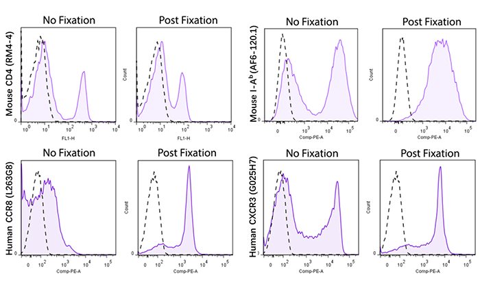 流式實(shí)驗(yàn)中,有一些情況我們希望或需要對(duì)樣本進(jìn)行預(yù)先固定處理,比如前文說過的傳染病人的樣本或者是需要檢測(cè)蛋白翻譯后修飾的樣本。對(duì)于需要預(yù)固定的樣本,首先需要考慮預(yù)先固定處理對(duì)檢測(cè)指標(biāo)的影響,有很多指標(biāo)先染色再固定和先固定再染色出來結(jié)果差異非常大,導(dǎo)致這些差異原因和指標(biāo)的類型、抗體的克隆號(hào)等因素都有關(guān)系。