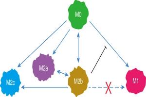 不同類型巨噬細(xì)胞的表型轉(zhuǎn)換。M0型巨噬細(xì)胞可以在不同誘導(dǎo)劑的作用下極化為M1M2M2aM2bM2c)。M2b型巨噬細(xì)胞可以在不同刺激下轉(zhuǎn)換為M2型巨噬細(xì)胞的其他亞型。值得注意的是,M2b型巨噬細(xì)胞抑制從M0M1的轉(zhuǎn)換。此外,在M1刺激劑的條件下,M2b型巨噬細(xì)胞不能重新極化為M1型。