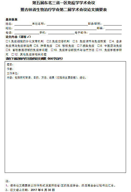 請于2017630日前將“論文摘要表”發送至所在省/區的免疫學會,然后再由會議秘書處匯總。